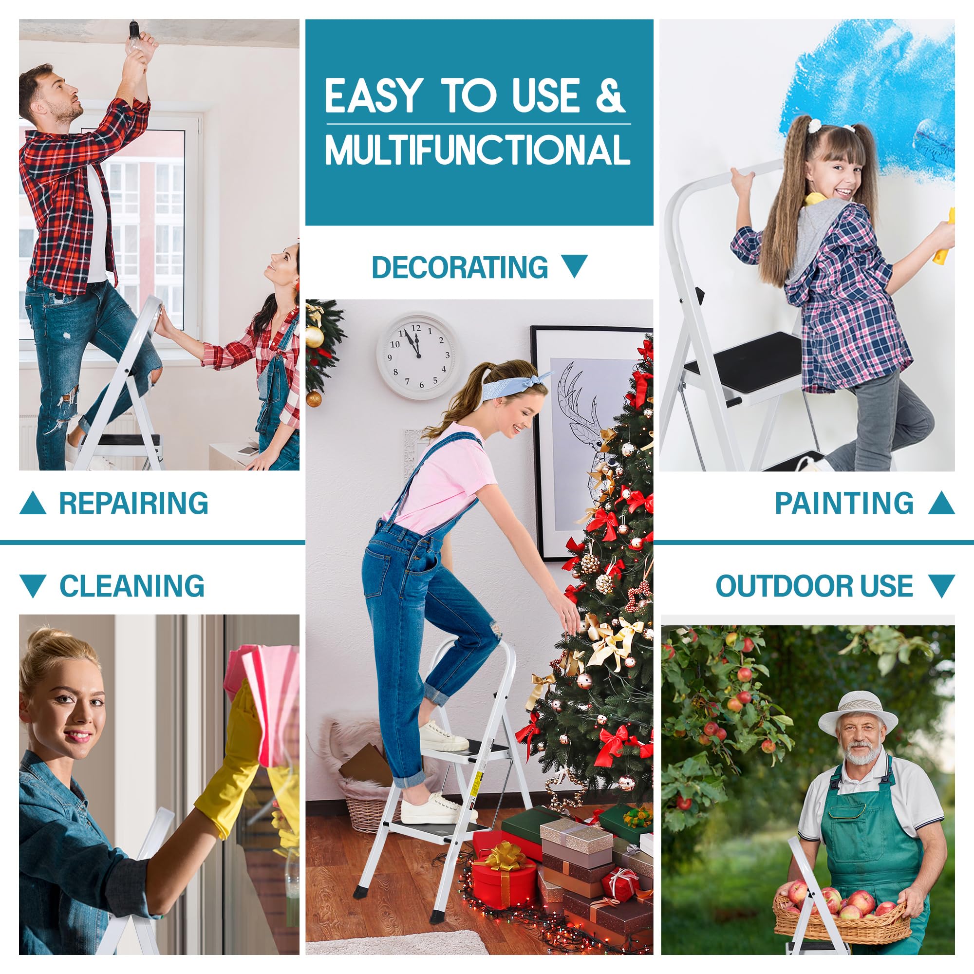- ăFolding Designă- ZENY 2 step ladder is foldable and allows for convenient storage and transportation. The convenient handle makes the step stool is very easy to climb and carry