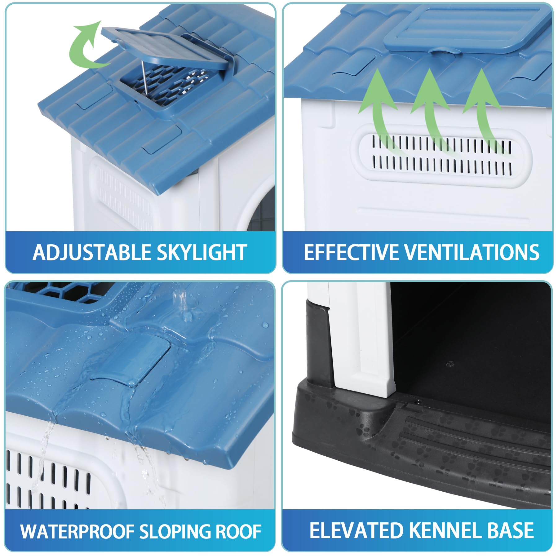 - ăAll weather designăThe sunroof is equipped with side windows and rear holes to provide air circulation and fresh air, keeping dogs cool in summer and warm in winter. This house also includes an elevated floor design that can be waterproof and dustproof. The sloping roof prevents rainwater from accumulating, so you don't have to worry about unpredictable weather.