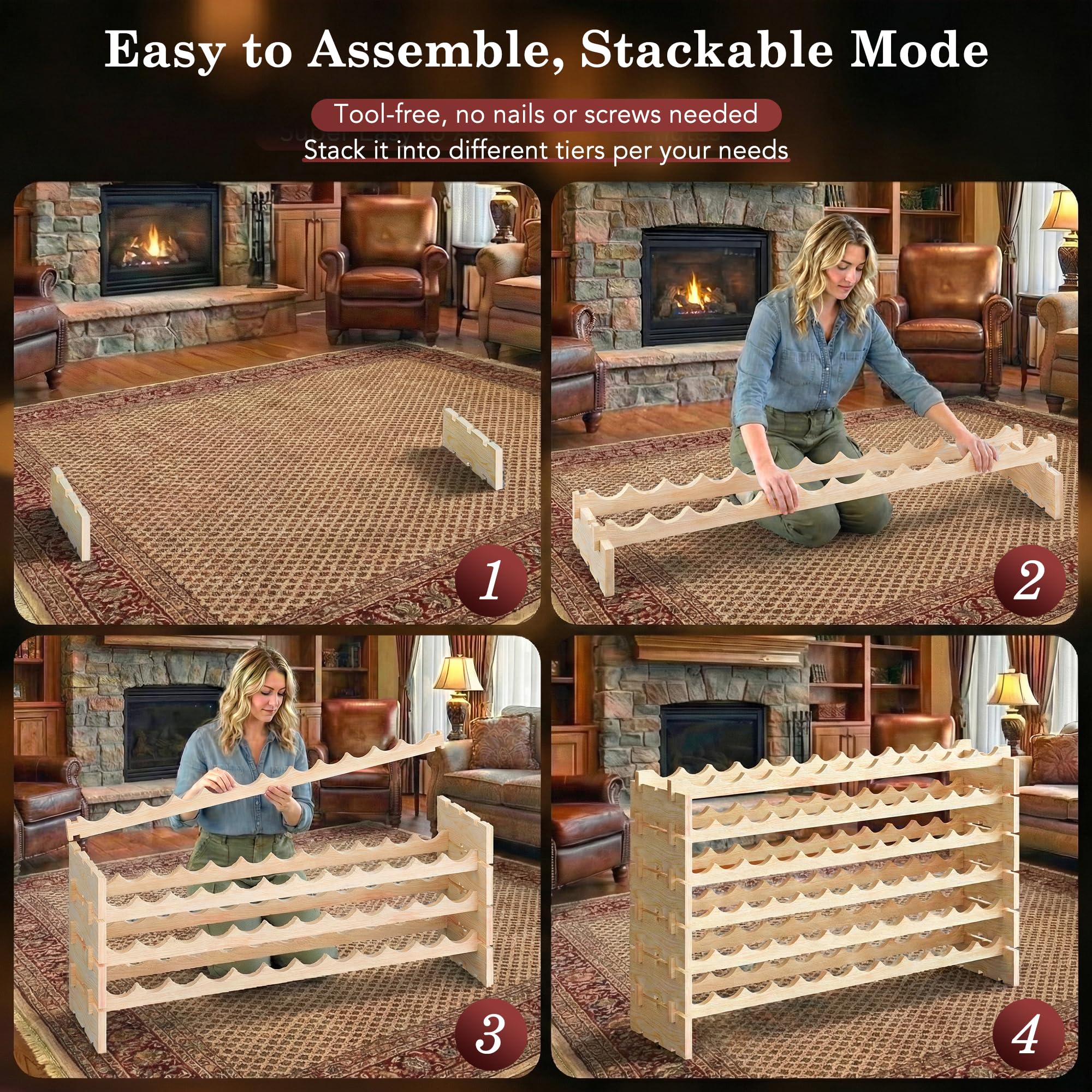 - ă6-Tier Stackable Designă- This wine bottle holder features a layered structure with stackable design and the arc design prevent wine bottles from sliding off the shelves. Each piece of the wood has notches and slots which are deep so they can fit together well and dowel pins to lock, makes the wine rack more sturdy and wobble-free on the floor.