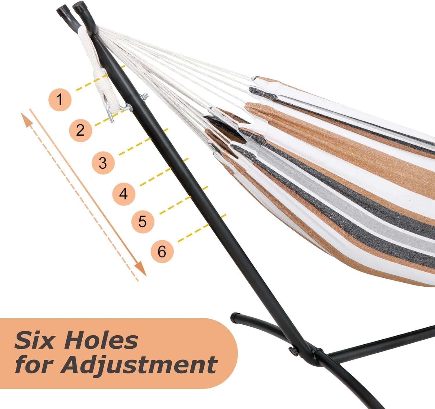 - SAFE AND ADJUSTABLE: U-shaped design at both ends, anti-sliding design. Fixed with knob, more firm, not easy to shake, more secure. There are 6 holes on the supports at both ends, and the height of the hook can be adjusted according to the length of the hammock