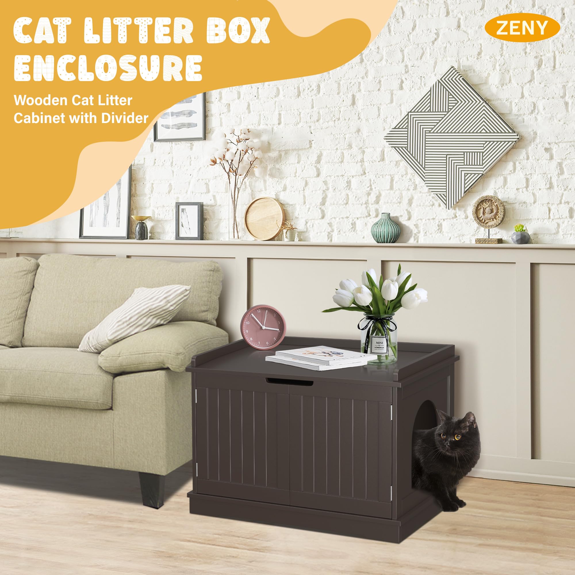 ZENY Cat Litter Box Enclosure Furniture Hidden, Wooden Cabinet with Divider, Modern Cat Washroom Storage Bench,Fit Most of Litter Box, Brown