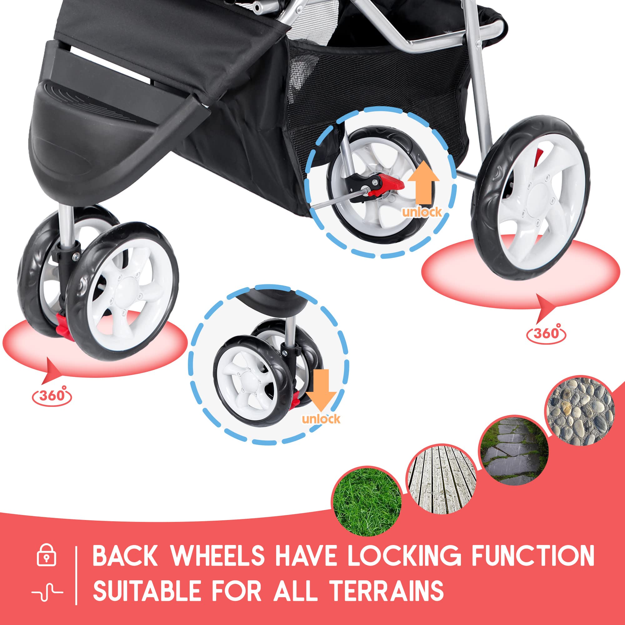 ZENY Foldable Pet Stroller, Cat/Dog Stroller with 3 Wheel, Pet Strolling Cart, Dog Travel Carrier with Storage Basket + Cup Holder, Black