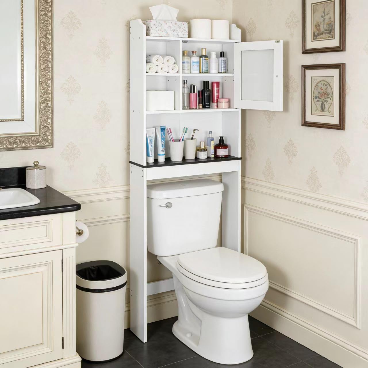 - ăBathroom Space Saveră- Bathroom space-saver cabinet conveniently fits over your toilet and is designed with 4 cubby hole compartments and one long open shelves providing sufficient space for bathroom organization and storage