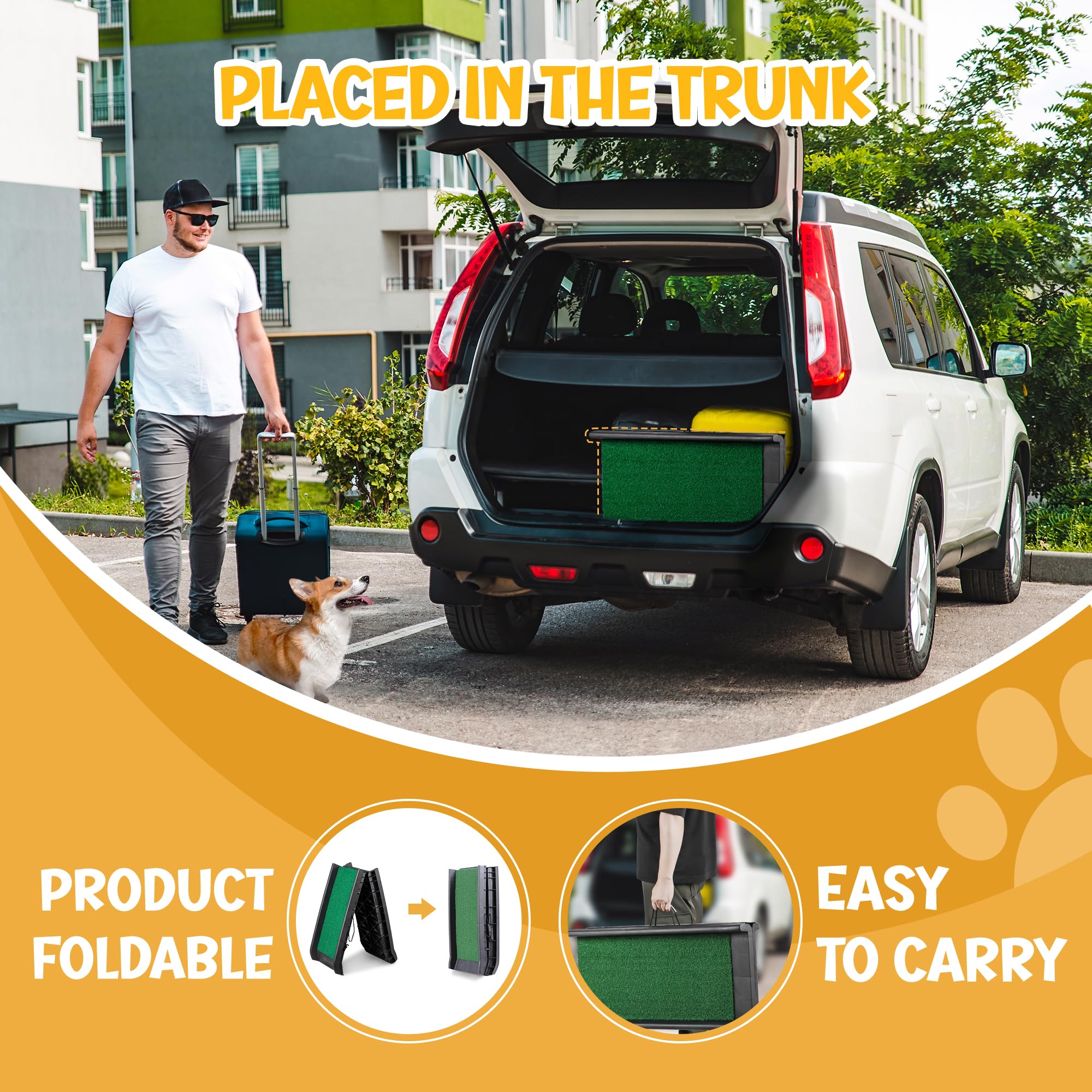 - LIGHTWEIGHT AND DURABLE - Bi-fold Pet Ramp with 11.56 lbs ultra light weight, it’s easy to pick up and transport; but durable enough to support pets up to 150 pounds, high traction lawn walking surface to help prevent slips, which is perfect for older pets or pets with mobility issues