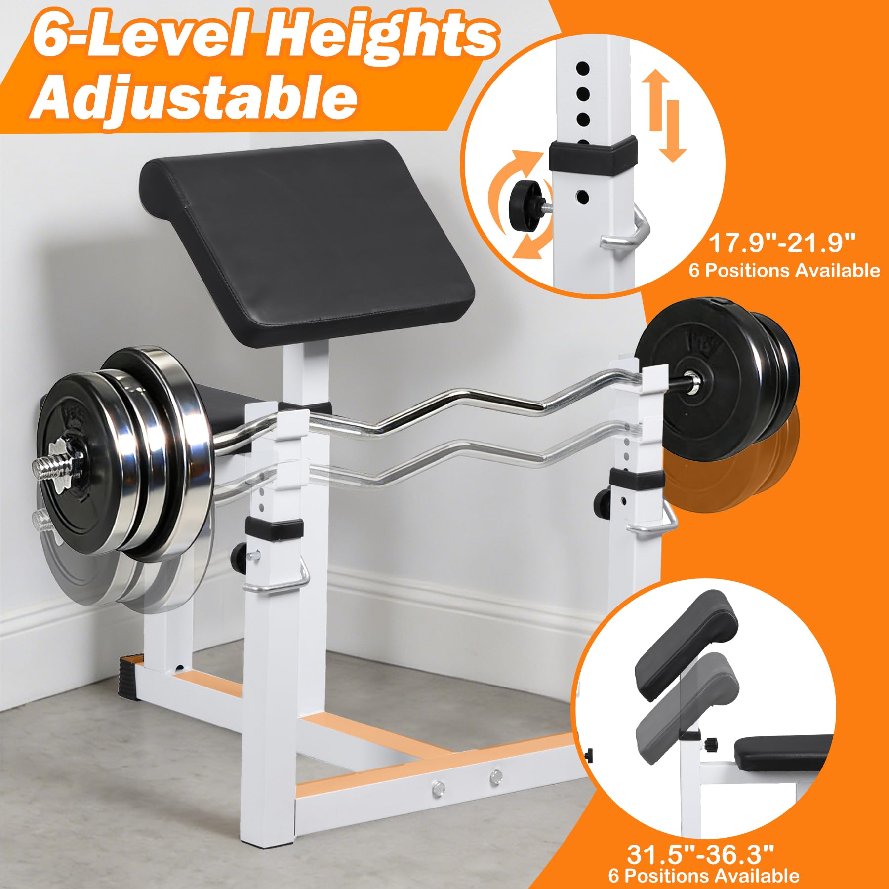 - ADJUSTABLE PREACHER WEIGHT BENCH: Adjustable bicep curl support and barbell rack height to ensure correct lifting form for both dumbbell/ barbell workouts to get maximum comfort
