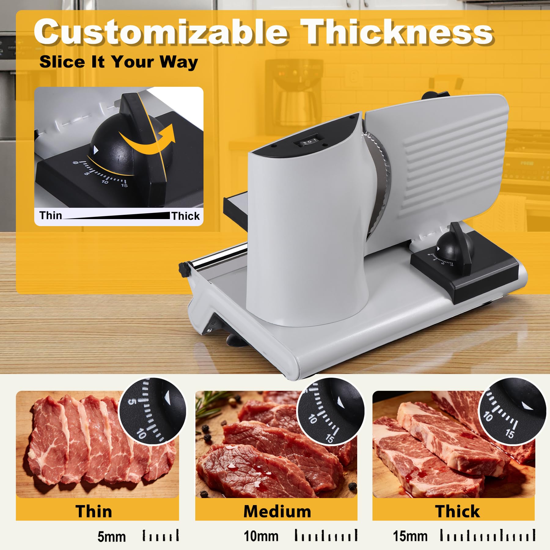 - Adjustable Thickness -- Numerical scale knob makes the adjustable plate to move back and forth and adjust the thickness approximately 3/4 ‘’ thick for precision sliced roasts, deli and cheeses. Perfect for preparing lunches, deli trays and buffet food for entertaining, party etc