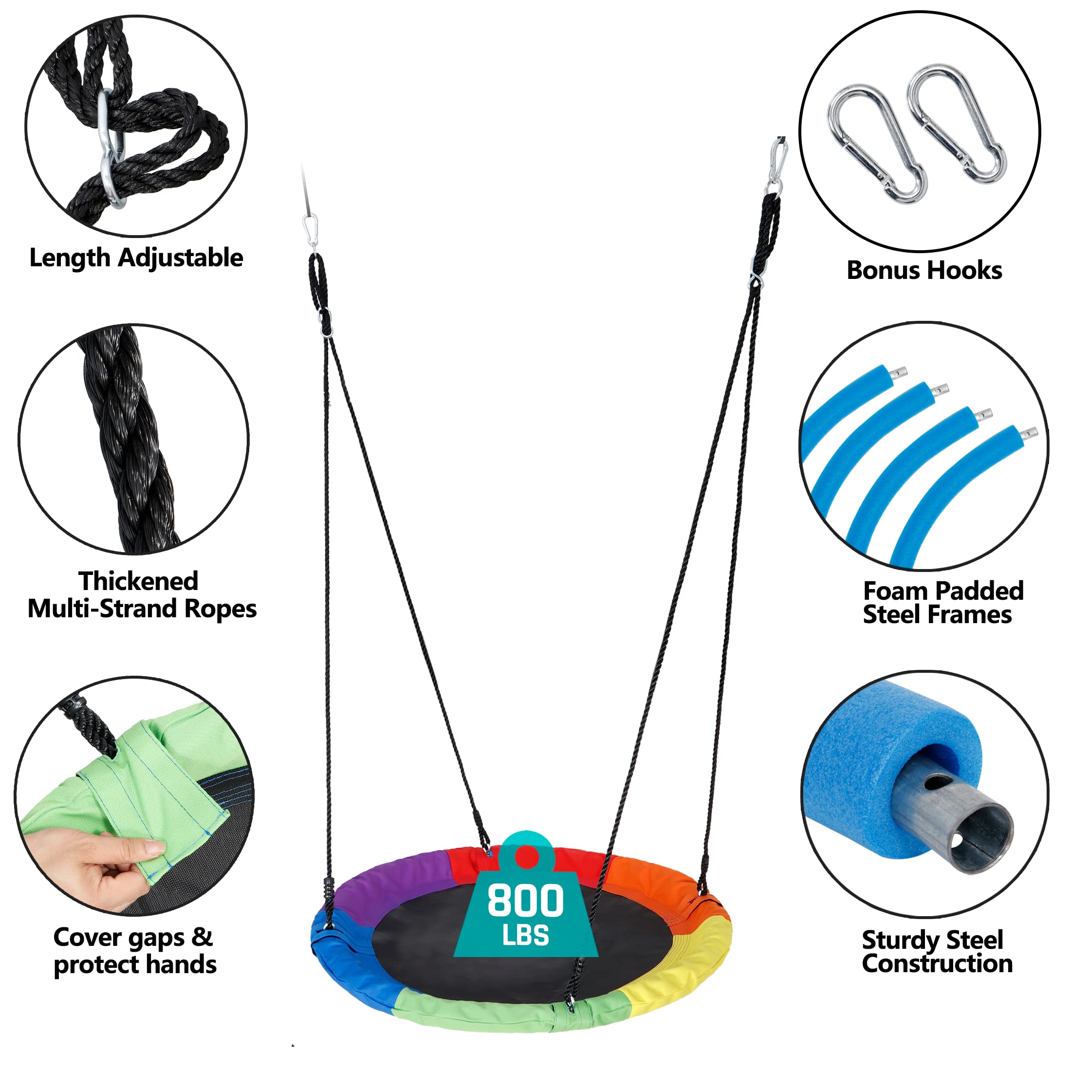 - HIGH WEIGHT CAPACITY: The kids swing is engineered with steel frame construction provides reliable support with an 700 lb capacity, this saucer swing is built strong enough to safely accommodate kids and adults alike