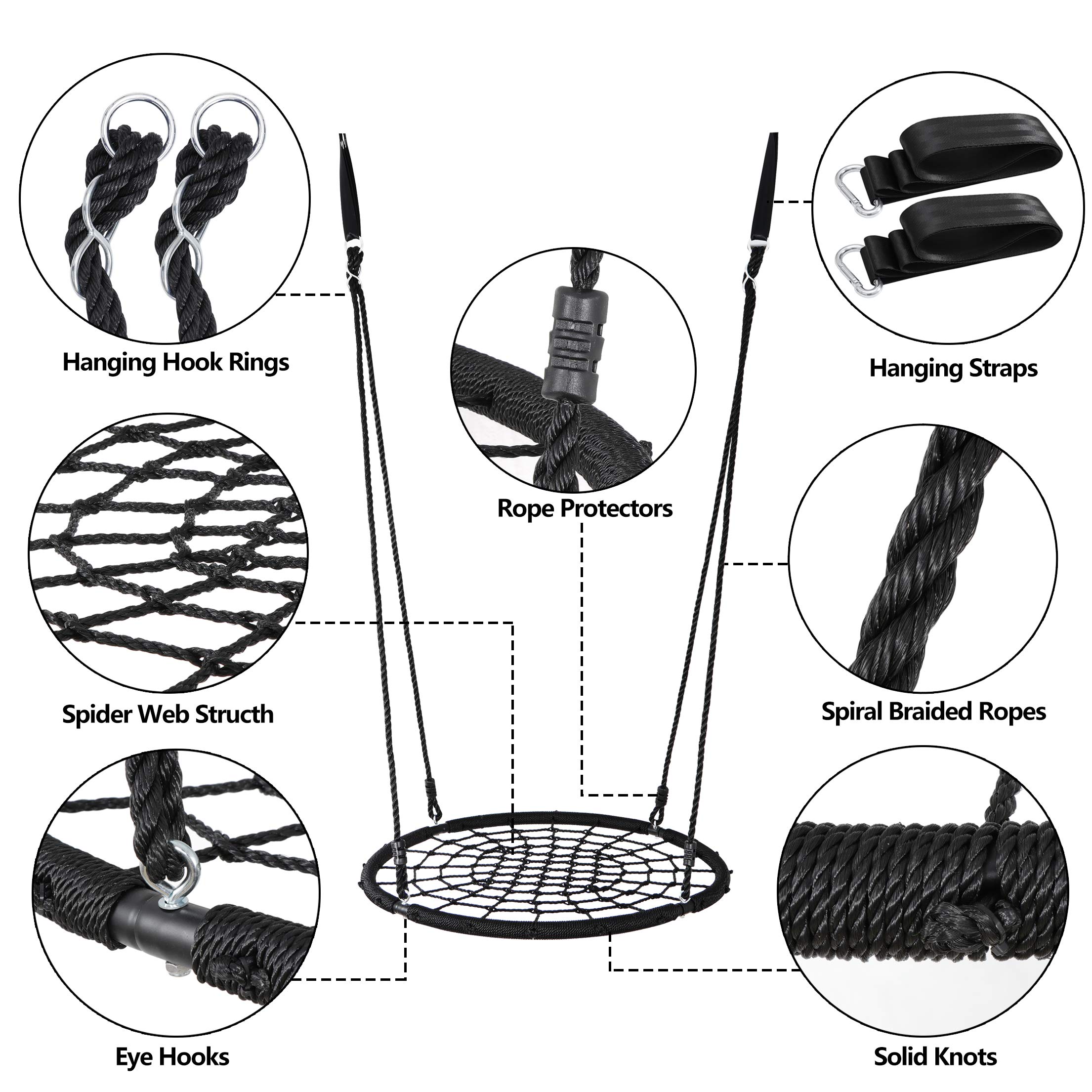 - DURABLE CONSTRUCTION AND EASY SETUP: Crafted from high-grade steel with a wrapped with durable net rope for long-lasting outdoor use and weather resistance. The spider web swing for outdoor can be detached into 4 parts. When you need a play time, just connect the 4 parts together and be sure that round tree swing is secured correctly